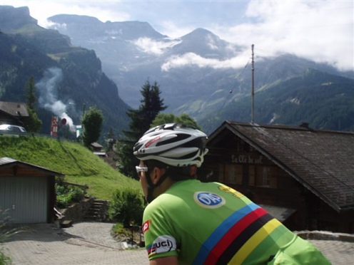 Jiří Ježek projíždí vysokohorskou vesničkou Les Diablerets a stoupá na vrchol Col de Pilon .jpg)